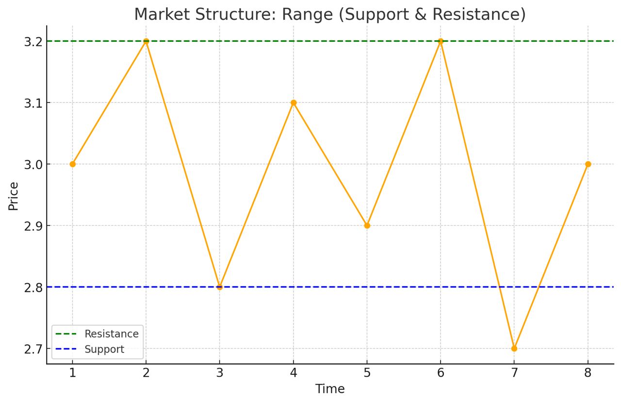 •Sideways/Range Market: Price moves between support and resistance without clear direction.